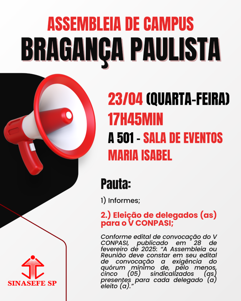 A Coordenação de Base do Campus Bragança Paulista da Seção Sindical São Paulo do SINASEFE convoca todas e todos os sindicalizados para participarem da Assembleia Geral Local, a ser realizada presencialmente, conforme as informações abaixo: