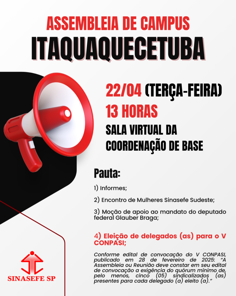 A Coordenação de Base do Campus Itaquaquecetuba da Seção Sindical São Paulo do SINASEFE convoca todas e todos os sindicalizados para participarem da Assembleia Geral Local, a ser realizada virtualmente, conforme as informações abaixo: