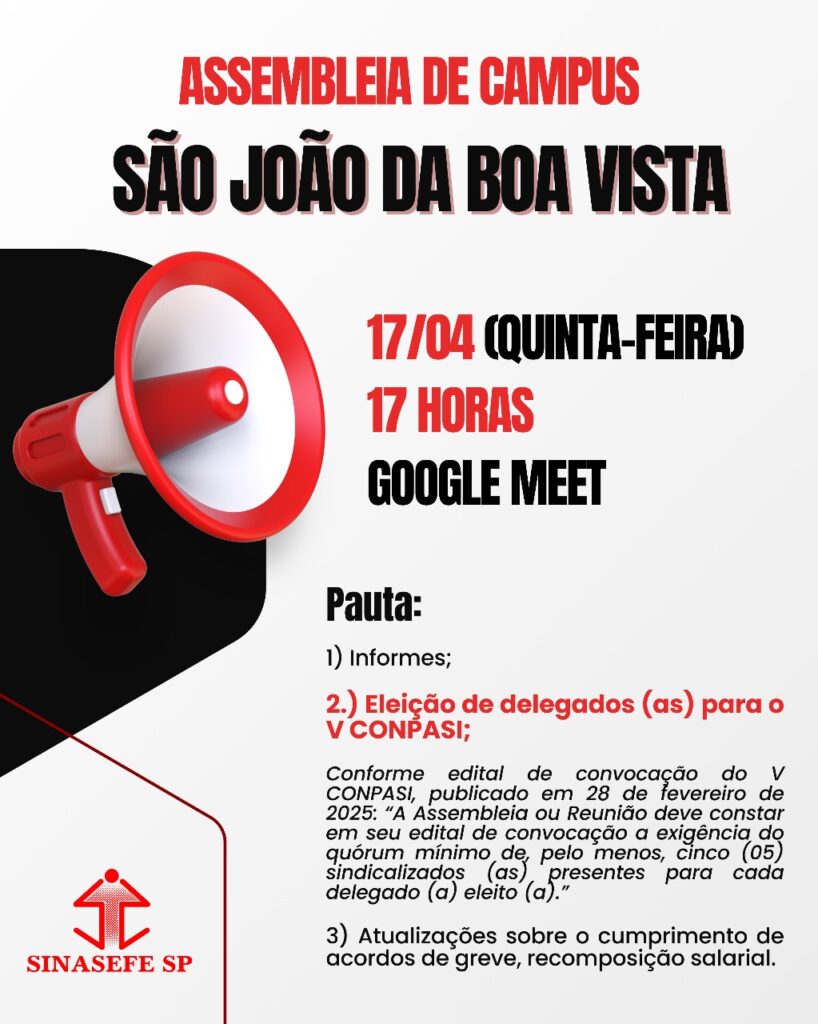 🚨🚩 CONVOCAÇÃO DE ASSEMBLEIA – CAMPUS SÃO JOÃO DA BOA VISTA